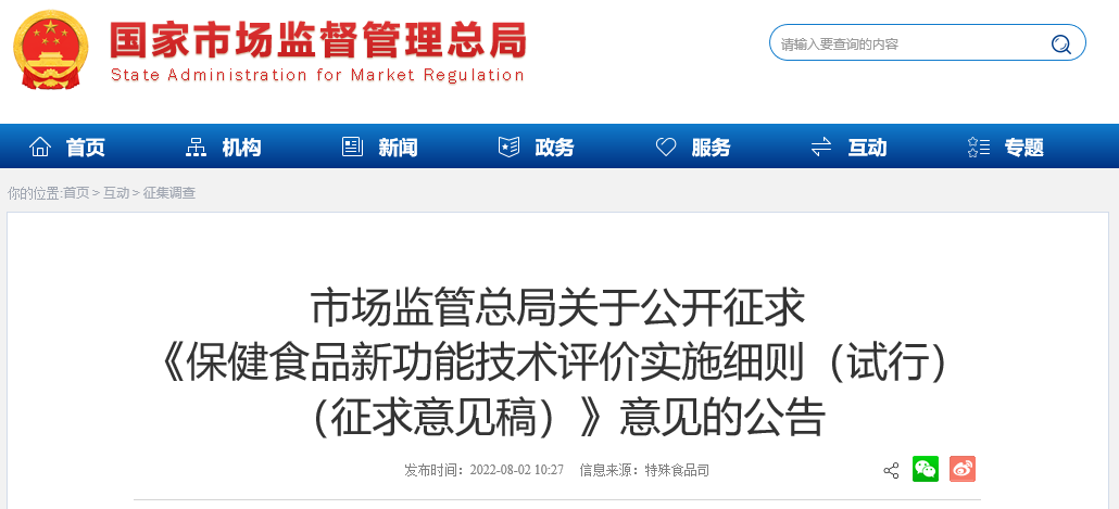 市場(chǎng)監(jiān)管總局根據(jù)《保健食品原料目錄和保健功能目錄管理辦法》,組織制定了《保健食品新功能技術(shù)評(píng)價(jià)實(shí)施細(xì)則(試行)(征求意見稿)》,現(xiàn)面向社會(huì)公開征求意見,意見建議反饋截止時(shí)間為2022年9月1日。公眾可以通過(guò)以下途徑和方式提出意見建議: